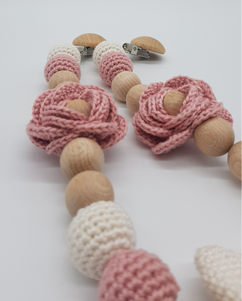Die Holzperlen eigenen sich sehr gut für Babys die zahnen, denn auf den Perlen kann gekaut werden, ohne dass es zu Abnutzung kommt, es kann keine Farbe oder Schrift abgehen. Sie sind BPA-frei.